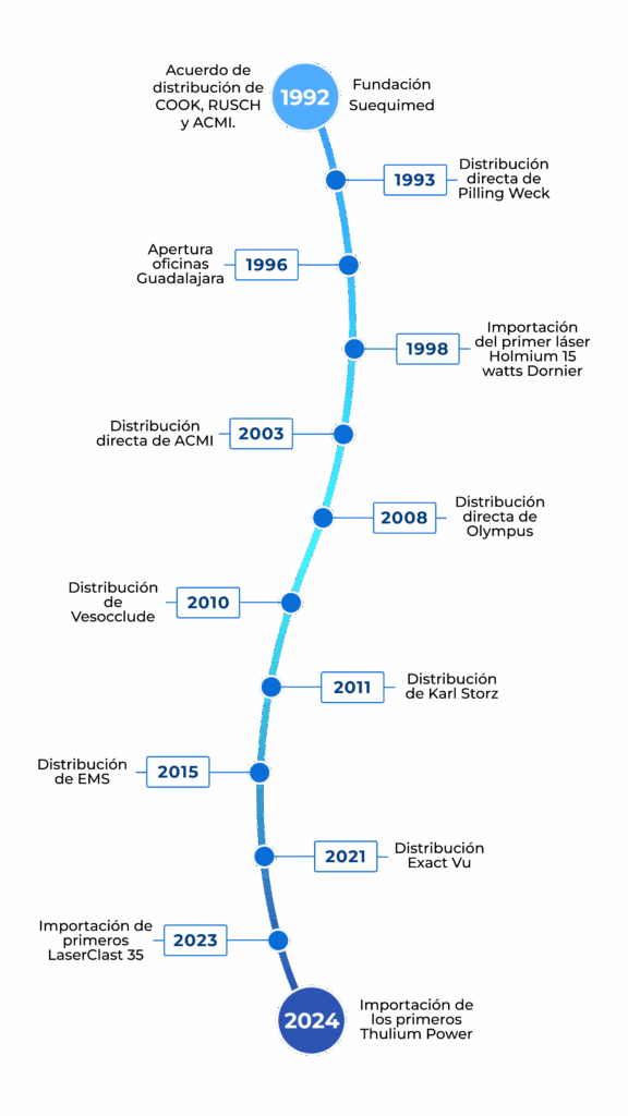 Fundada en Monterrey en 1992, Suequimed es una empresa 100% mexicana especializada en la distribución de material médico para urología y ginecología. Con más de 33 años de experiencia, hemos consolidado nuestra presencia en el sector, ofreciendo equipos y consumibles de alta calidad respaldados por un servicio profesional y personalizado.